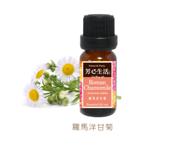 它的氣味帶著成熟蘋果的甜美香氣,成分中因含有相當高比例的酯類,經常被用來處理情緒方面的狀況,可用在安撫鎮定負面情緒,舒緩神經痙攣和平穩中樞神經等方面,再加上羅馬洋甘菊是一支非常溫和的精油,因此特別常被推薦稀釋後用在幼兒身上,緩解寶寶們不安躁動的情緒或各種身體不適。